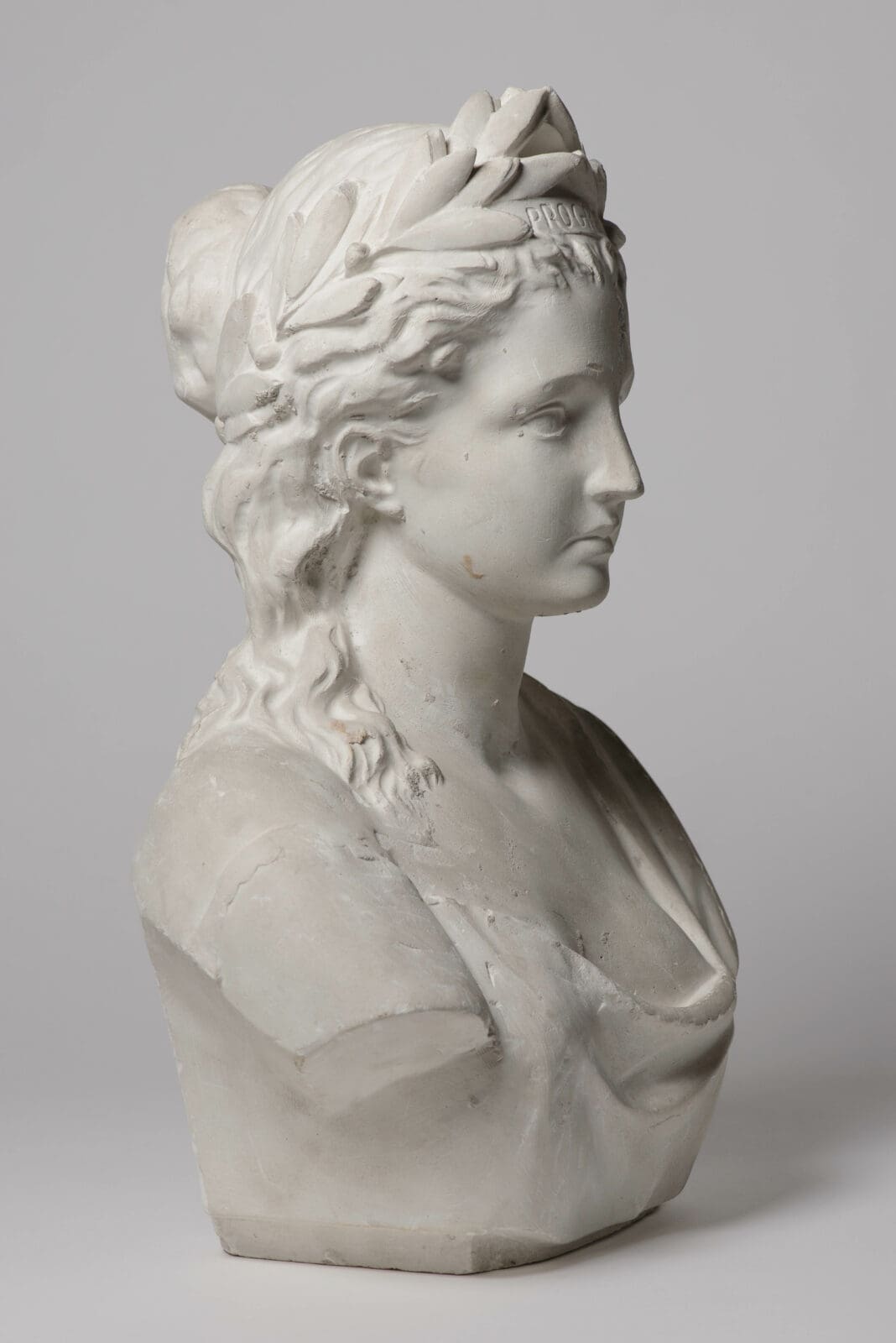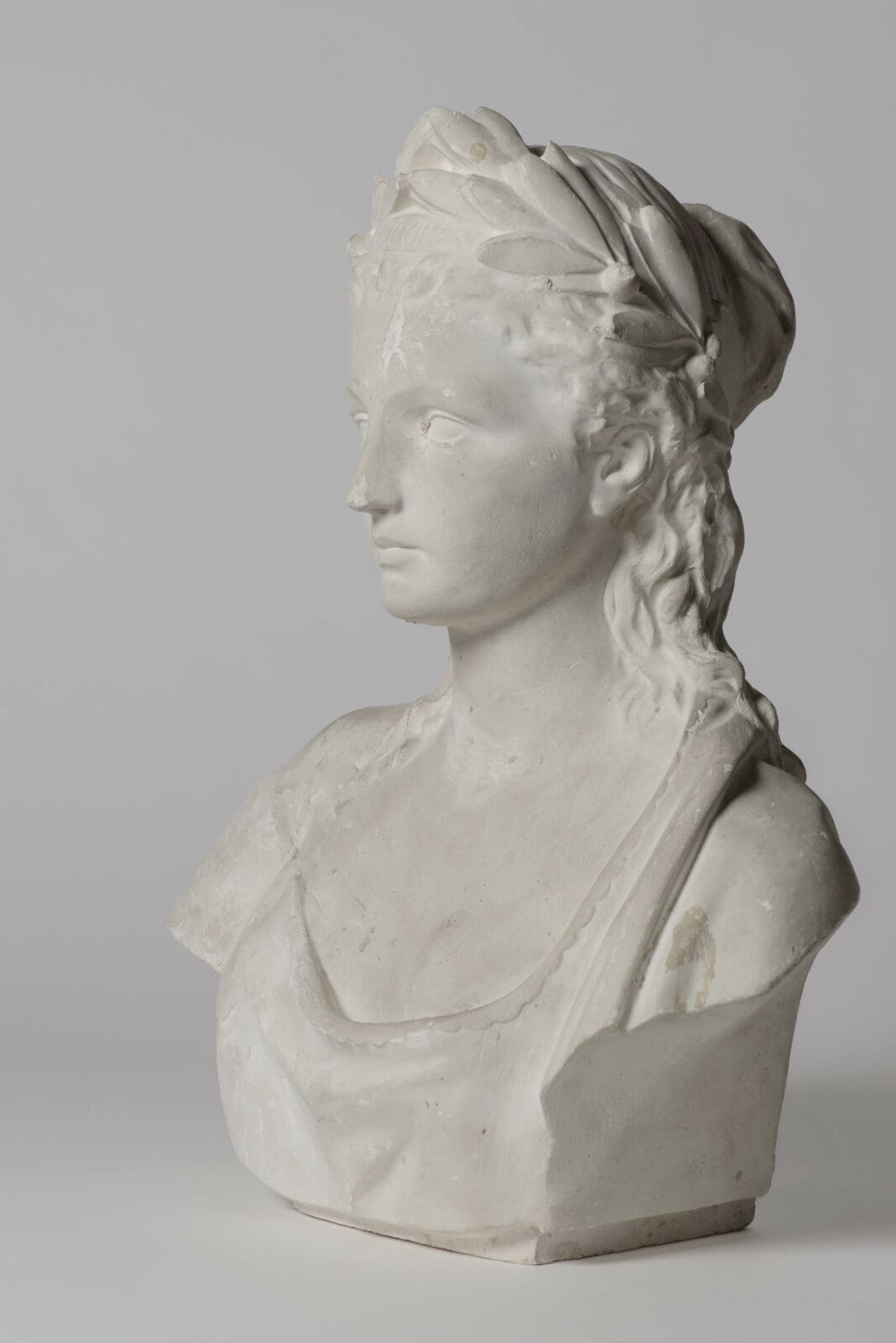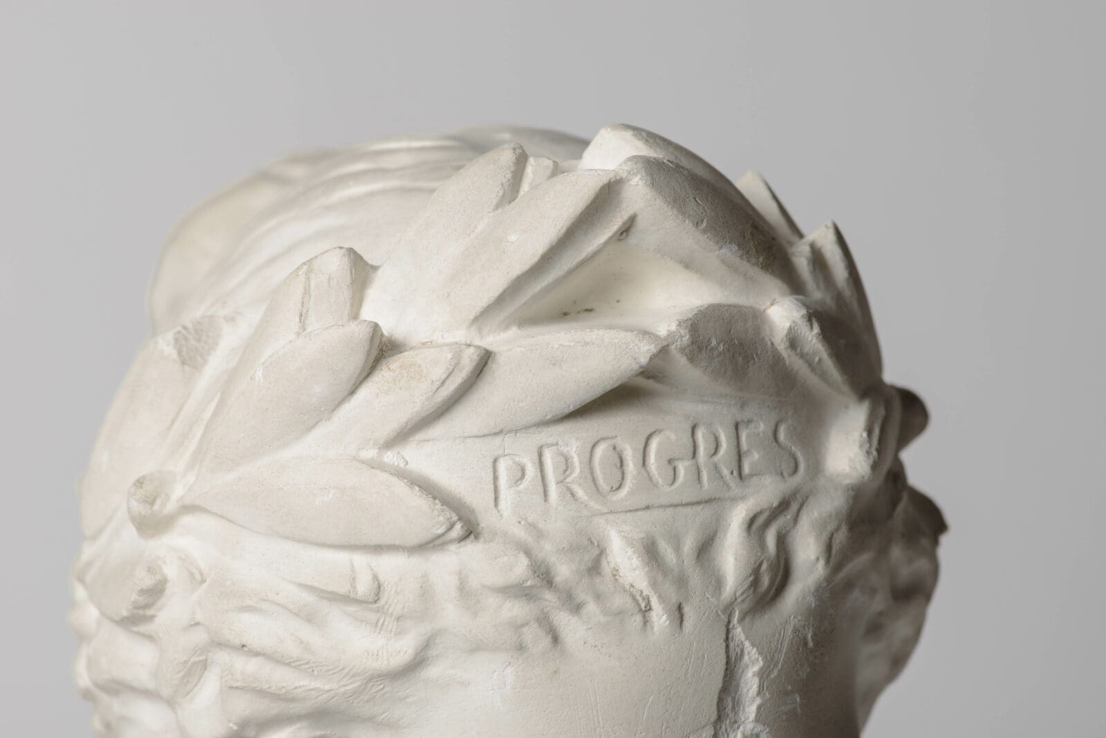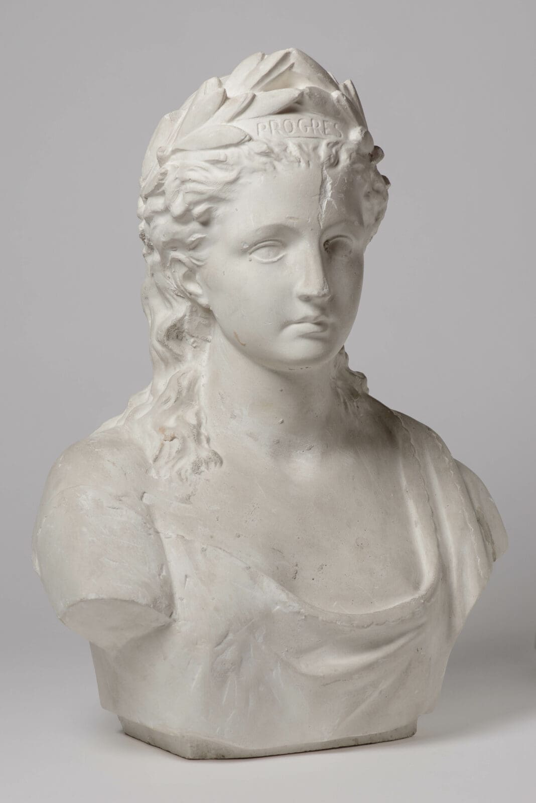 La Marianne de Léopold Mérignargues restitue le visage d’une femme aux traits réguliers, dont l’expression inspire la dignité et la noblesse du symbole de la République. Ses pupilles aveugles renvoient à la tradition antique d’une figure allégorique, intemporelle.