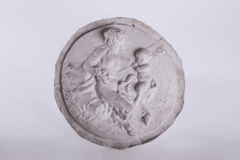 La faunesse est l’équivalent féminin du satyre, aussi appelé faune. Elle appartient à la mythologie gréco-romaine et est associée aux Bacchanales, fêtes votives en l’honneur du dieu éponyme, Bacchus. Reconnaissable à ses pattes de bouc, la faunesse est au centre de la composition, assise dans un moment d’intimité, attentive aux mouvements de son enfant. Le choix de cette iconographie rend compte de la permanence des thèmes mythologiques traités par Clodion, dont l’iconographie, le format et le traitement en relief s’adaptent sans peine à des supports et une clientèle variés.
