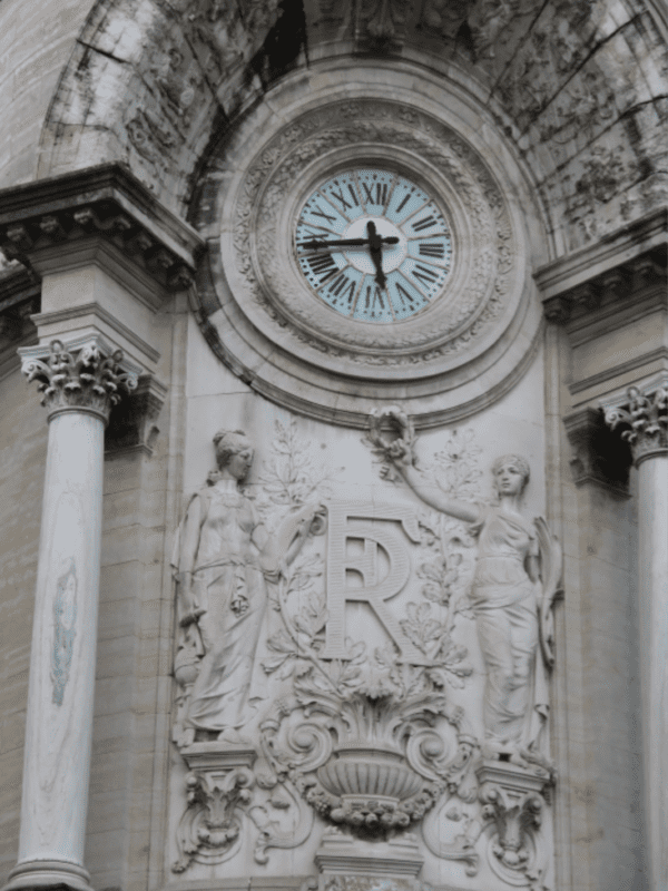 Les dessins préparatoires illustrent un décor qui entoure deux allégories. Sur le premier dessin la présence des ombrages permet d’imaginer les futures perspectives, tandis que sur le second dessin, les tracés sont plus net et la perspective moins mise en avant. Seuls les abaques ainsi que l’amphore sont dessinés en perspective. Dans la composition finale, tous les éléments sont sculptés en bas ou haut-reliefs, y compris le sigle RF, qui, dans le second dessin, apparaît en deux dimensions. De nombreux éléments du premier croquis ne sont pas conservés dans la composition finale