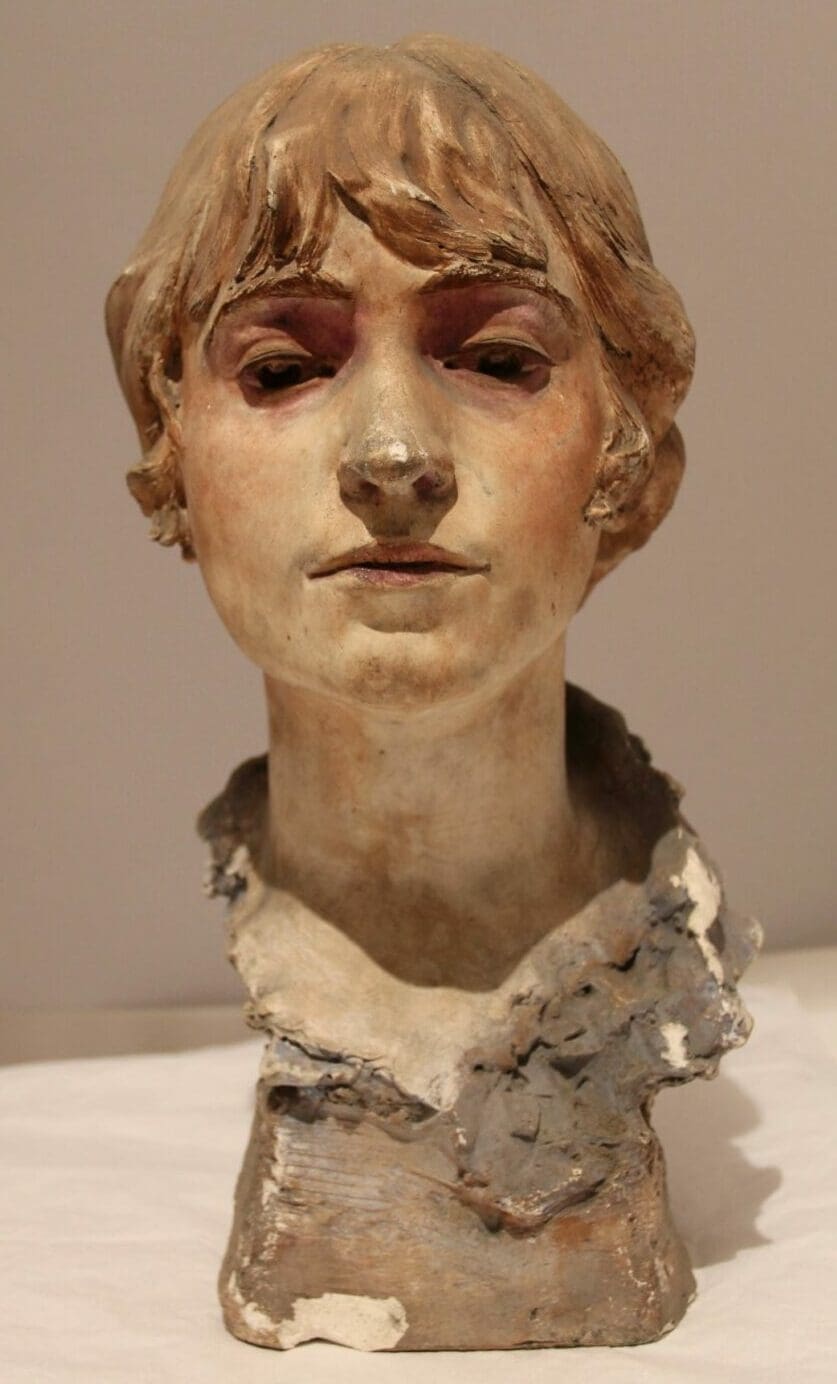 Dans la collection des Mérignargues, les bustes sont omniprésents, et notamment les portraits intimes. Le buste de l’épouse de Marcel, Valentine Mérignargues, est l’une des réalisations les plus intéressantes dans la mesure où elle conjugue virtuosité de la sculpture et audace picturale : le travail du modelage est réhaussé d’une fine polychromie.